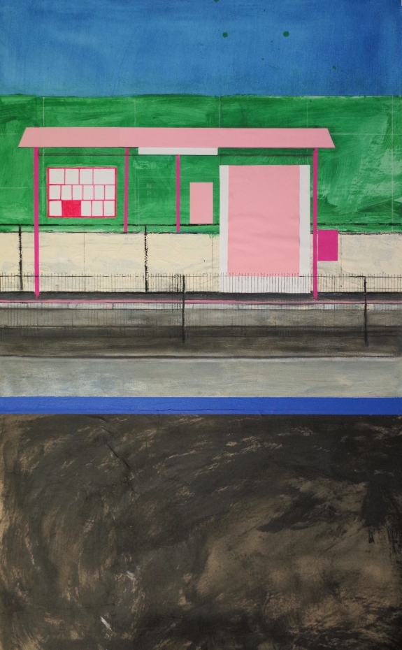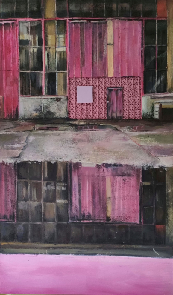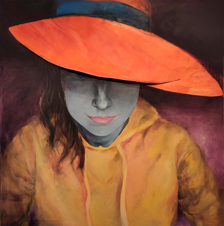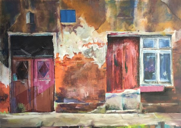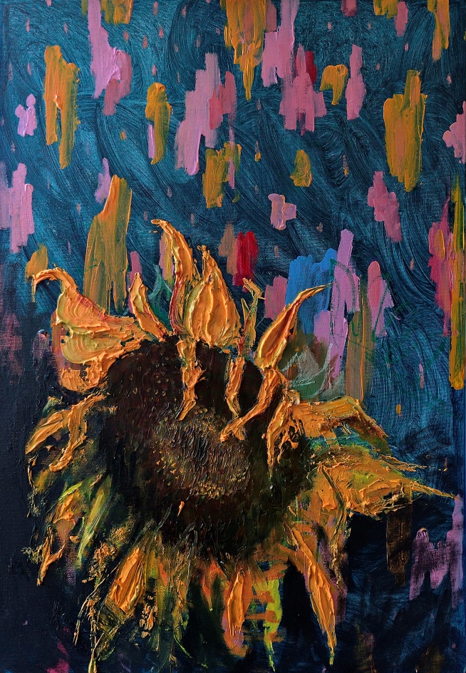 w deszczu, farba akrylowa i masa strukturalna na płótnie,
